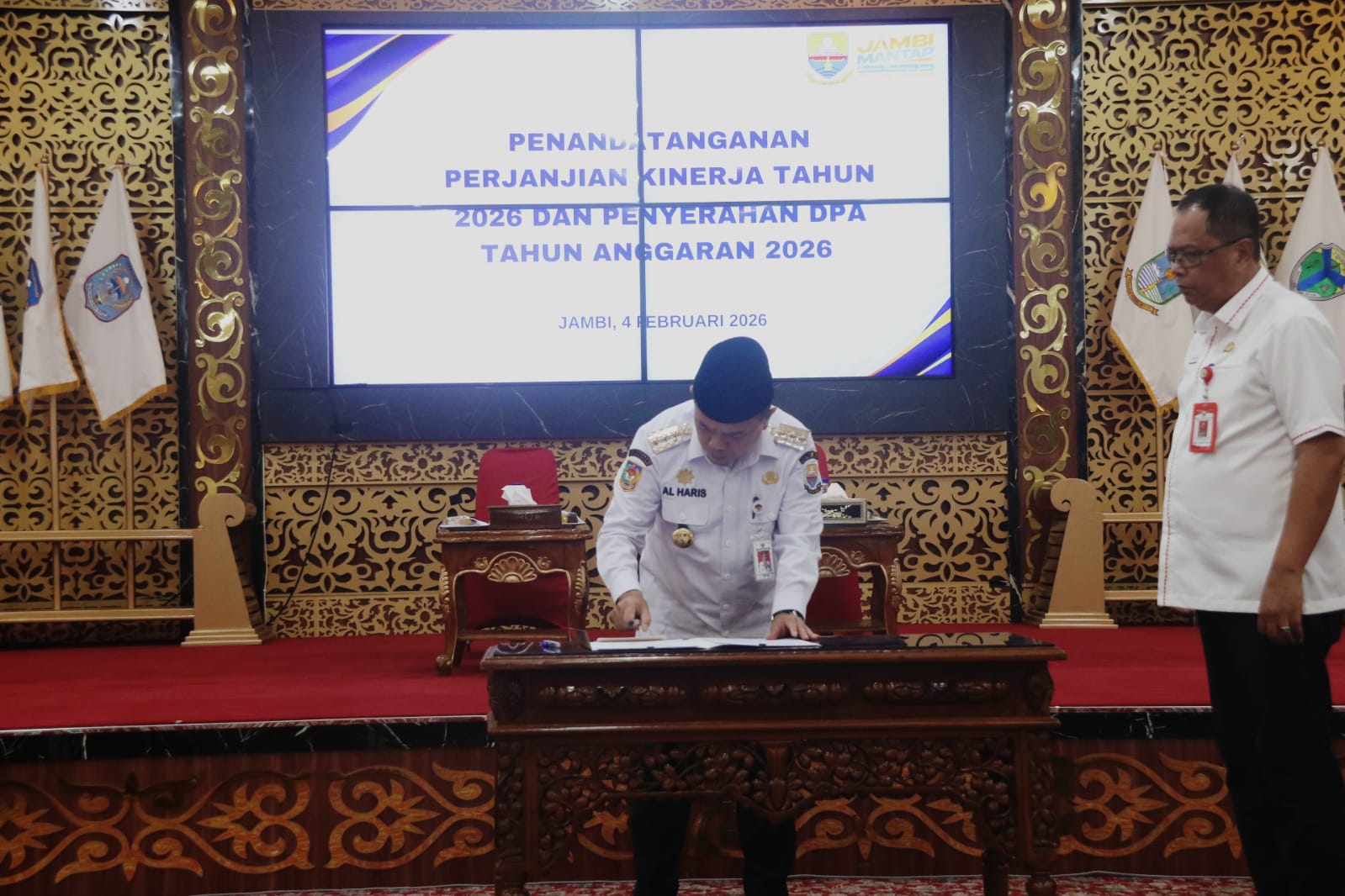 DRADIO.ID – Jambi , Gubernur Jambi Dr. H. Al Haris, S.Sos., MH menegaskan pentingnya komitmen kerja yang terukur, fokus, dan dapat dipertanggungjawabkan dalam penyelenggaraan pemerintahan melalui Penandatanganan Perjanjian Kinerja Tahun 2026 yang dirangkaikan dengan Penyerahan Dokumen Pelaksanaan Anggaran (DPA) Tahun Anggaran 2026, bertempat di Ruang Pola Kantor Gubernur Jambi, Senin (04/02/2026) siang.