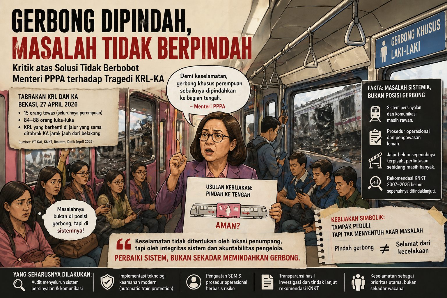 Dengan demikian, locus problematik berada pada sistem keselamatan rel, bukan pada komposisi spasial penumpang berdasarkan gender.