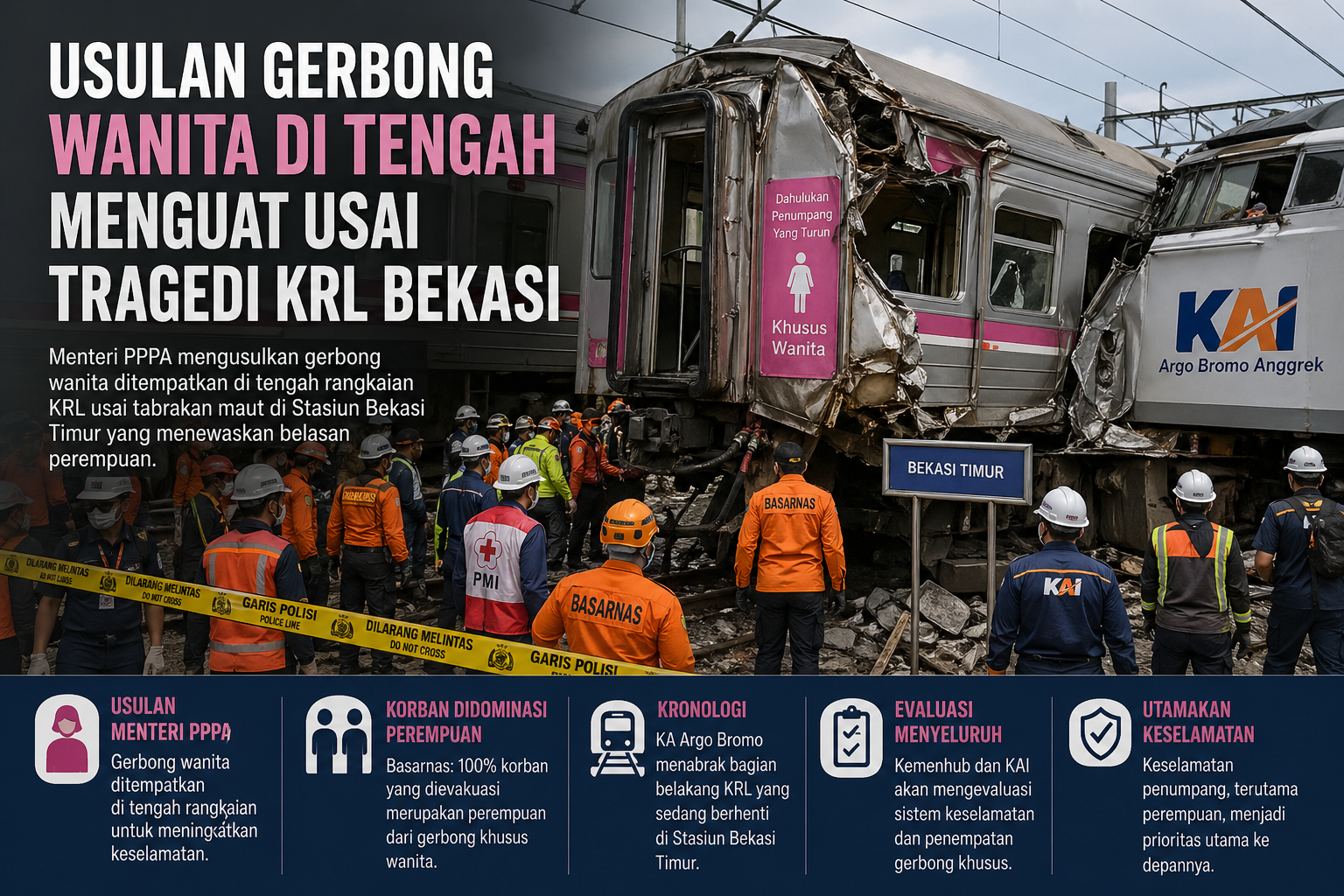 DRADIO.ID – Menteri Pemberdayaan Perempuan dan Perlindungan Anak (PPPA), Arifah Fauzi, mengusulkan perubahan penempatan gerbong khusus wanita pada Kereta Rel Listrik (KRL) agar berada di tengah rangkaian. Usulan ini muncul sebagai respons atas kecelakaan tragis yang melibatkan kereta api di Stasiun Bekasi Timur.