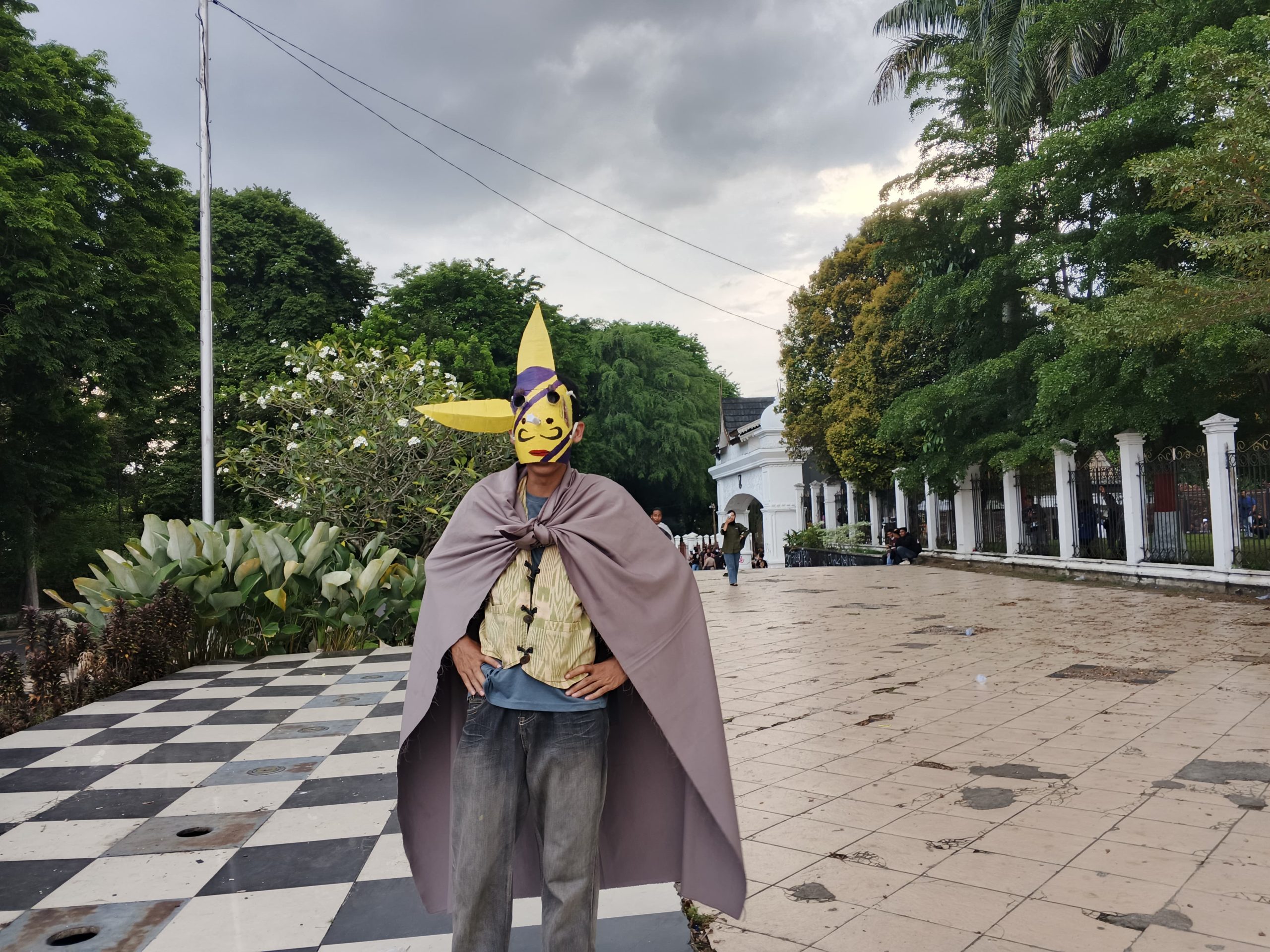 Di tengah barisan aksi, perhatian massa sempat teralihkan oleh kehadiran seorang demonstran yang tampil berbeda. Ia mengenakan kostum Usop, salah satu karakter dalam anime populer One Piece. Dengan hidung panjang buatan, bandana, dan perlengkapan khas karakter, sosok ini berjalan di antara kerumunan bak simbol perlawanan kreatif. Banyak mata tertuju kepadanya, bahkan beberapa peserta aksi terlihat mengabadikan momen tersebut dengan ponsel mereka.